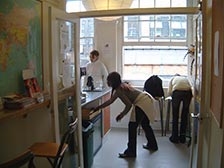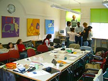 ロンドンの都心からちょっとだけはずれた場所、カムデン地区は、リージェント・パークに近く、マーケットでも有名ですが、駅前はロンドンらしく、賑やかです。駅を降りてすぐの商店街の一つのビルが学校で、簡単に見つかります。土地が狭くて高いロンドンにあって、スタディー・ラウンジと呼ばれる広い部屋を確保し、そこは斬新なモダンアートの絵がかかるカラフルな部屋で、授業後も学生がくつろいで談笑していました。無料インターネットもあり、コーヒーも飲み放題。そしてスタッフもフレンドリーで、居心地が良さそうでした。